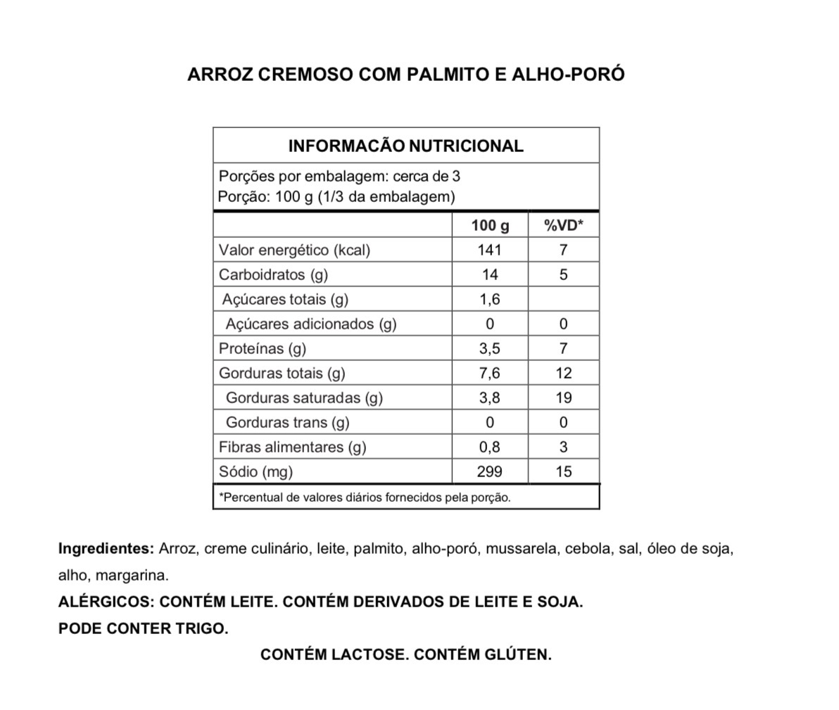 Arroz cremoso com palmito e alho-poró, equilibrado e aromático.